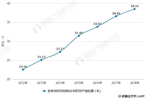 根据前瞻产业研究院分析,3D打印材料作为3D打印的重要物质基础,3D打印材料的发展直接制约着3D打印技术的发展。随着3D打印产业规模越来越大,3D打印材料在整个行业中的地位也愈加重要。2017年,全球3D打印材料市场约占全部3D打印市场的36.63%,预计到2018年,全球3D打印材料市场规模将会进一步扩张,且增速略大于全球3D打印市场,所占比重进一步提高,超过38%。