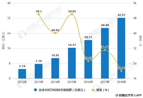 据前瞻产业研究院发布的《中国3D打印材料行业发展前景预测与投资策略规划报告》统计数据显示,截止至2017年全球3D打印材料市场规模增长至26.89亿美元,较上年增长31.11%。预计2018年全球3D打印材料市场规模将会突破30亿美元达到了32.27亿美元。全球3D打印材料市场规模近5年来一直维持20%以上的增速,处于稳定快速的发展期,随着3D打印技术应用领域的不断拓展和越来越多的3D材料面世,全球3D打印材料市场将会继续保持稳定增长的趋势。