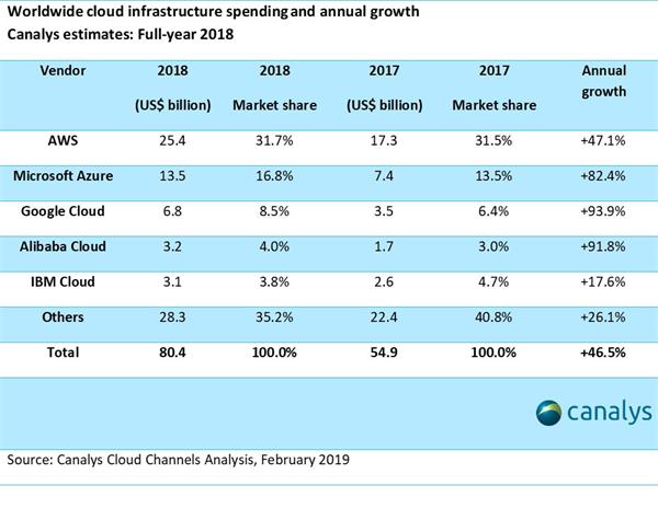 目前全球云竞争格局,从全球营收规模来看,亚马逊AWS、微软Azure和谷歌云是全球三大云服务商,他们占住了全球一半以上份额,依据Canalys给出的数据显示,2018年云计算市场规模同比46%至804亿美元。