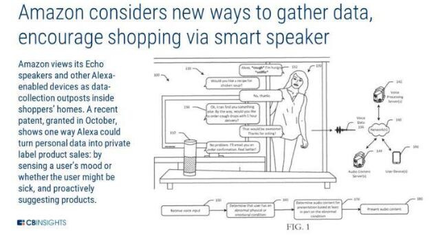 上图显示了最近亚马逊的一项专利,该专利使用智能扬声器收集数据并鼓励购物。