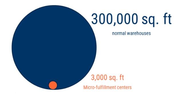 上图显示的这种微型履行中心通常只占用3000平方英尺,而传统仓库可能需要多达300,000平方英尺。
