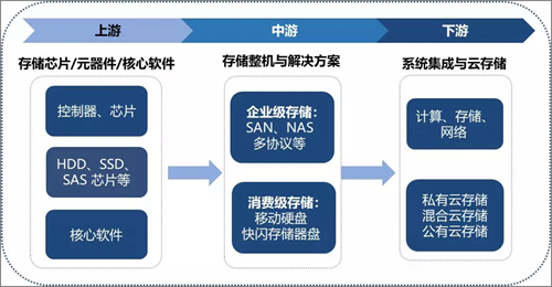 下游主要由系统集成商与云储存服务商构成。由于存储行业终端使用者的IT需求往往是综合计算、网络、存储三方面的,通常情况下行业内厂商专注于存储领域,系统集成能力相对有限,因此,需要依靠专业的系统集成商来完成终端产品提供。目前中国国内系统集成商市场中,本土集成商占88.7%,外资系统集成商占3.7%,合资系统集成商占7.6%。在云计算和大数据快速发展的大背景下,市场中云存储服务提供商在众多参与者中逐渐凸显,云存储服务商不再出售硬件,而是通过集群或分布式文件系统等,对外提供数据存储和业务访问功能。存储行业的下游终端用户广泛分布,市场发展潜力巨大。