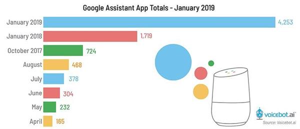 近日,Voicebot 给出了一组分析数据,终于披露了 Google Actions 的最新进展:共 4,253 个,远远落后于 Alexa。但由于基数小,Actions 数在过去一年增长了 2.5 倍。在同一时期,Alexa 技能数实现了 2.2 倍的增长。