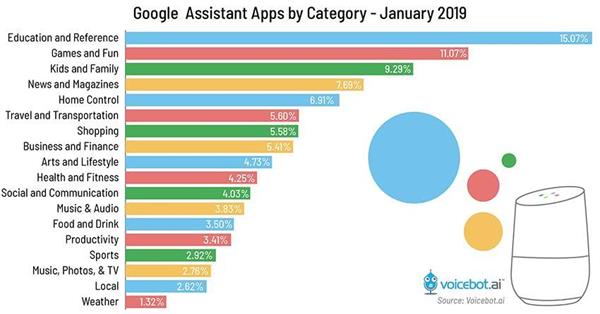 具体来说,Google Assistant Actions 被分为 18 个大类别,其中,教育与参考(Education and reference)、游戏和娱乐、儿童与家庭这三类的占比位列前三,分别为 15%、11%、9%。排在最后的两类分别为天气、本地(Local)。