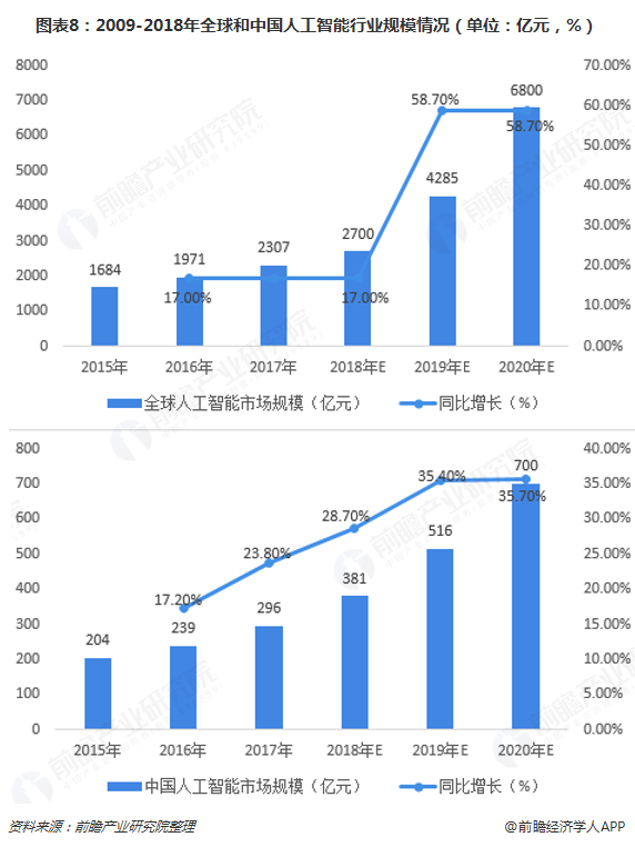 根据前瞻产业研究院报告,由于政策和资本助力,中国人工智能规模增长速度在2017年大于全球,为23.8%。目前,全球人工智能规模增速保持在17%左右,预计2020年达到千亿美元市场。随着政策的出新和国家对制造业的高度重视,人工智能市场将迎来新兴机遇点,2018年人工智能市场规模有望超过380亿元,2020年有望达到百亿美元市场。
