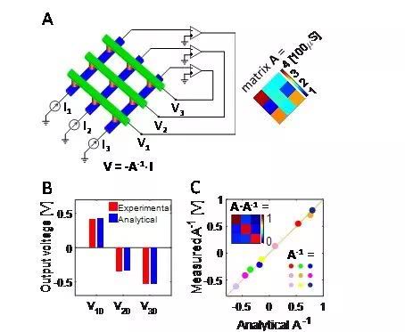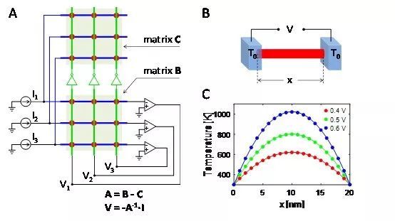 近年来,存内计算(in-memory computing)兴起,通过在存储单元内完成计算将显着提高计算效率。一个典型的存内计算例子是利用阻变存储器(或称忆阻器)的交叉阵列一步完成矩阵-向量乘法的运算,从而快速完成包括训练神经网络在内的大数据任务。然而,一步解矩阵方程,如线性方程组Ax = b,仍然是一个挑战。在我们最新的PNAS文章里,我们报道了利用交叉存储阵列,通过引入反馈电路,可以一步解线性方程组和矩阵的特征向量,进而实现一步解微分方程,包括傅里叶方程、薛定谔方程,和一步完成谷歌的网页排序。