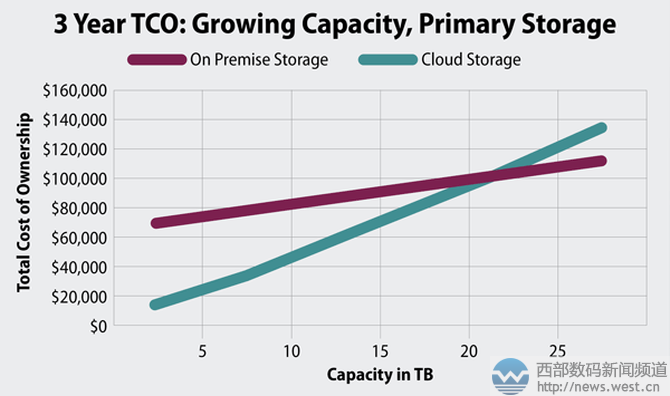 在较低的数据级别上,云存储的成本要比本地存储便宜得多。但是随着存储总量的增加,总成本也在增加。
