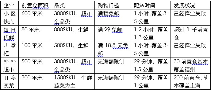 上文介绍了小区快点、U掌柜、朴朴超市、每日优鲜和叮咚买菜这5家前置仓企业,分析对比如下: