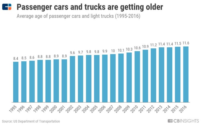 1995年至2016年美国乘用车和轻型卡车平均使用时间