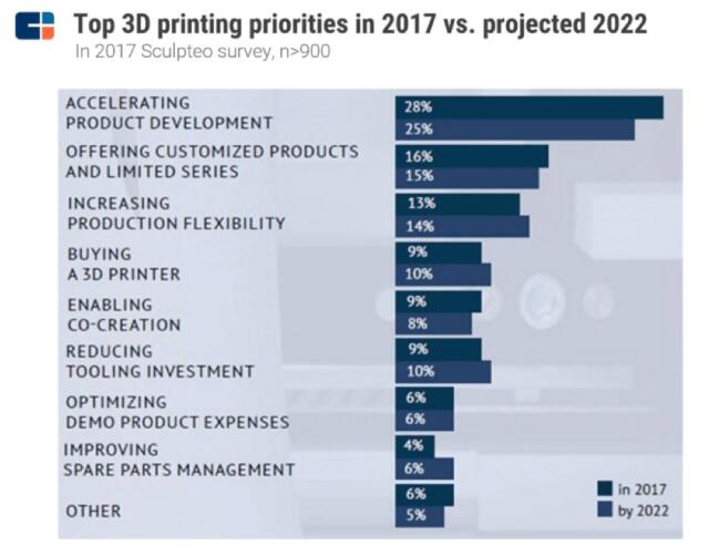 其中,这些应用按占比排行分别是加快产品发展、提供定制产品和限定系列,和增加产品灵活性、共同创造、减少工具投资、优化模型产品开支、提高零部件管理,和其他因素。