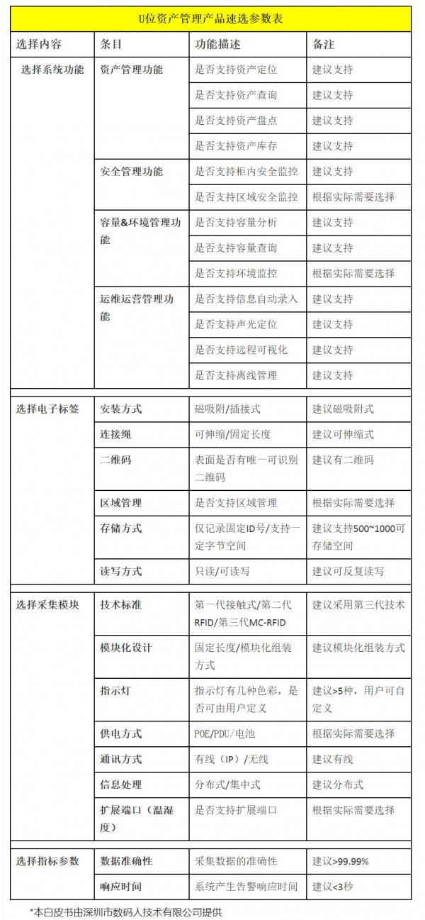 下表总结了数据中心U位资产管理产品的主要选择标准,用户可根据需要使用。