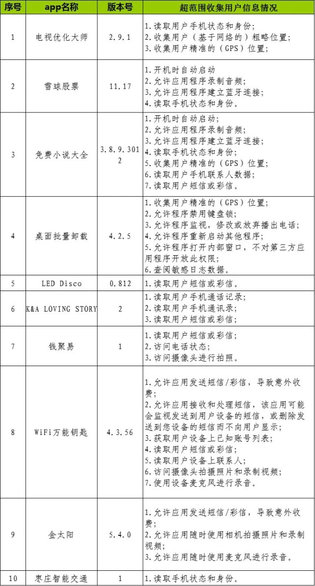 据了解,在这千余款APP中,“电视优化大师”“雪球股票”“免费小说大全”“ 钱聚易”等10款APP,存在读取用户通话记录、短信或彩信,收集用户通讯录、用户设备上已知账号,超权限使用用户设备摄像头或麦克风等突出问题。目前,我省公安机关已将有关监测情况上报公安部通报属地公安机关开展清理整治工作。