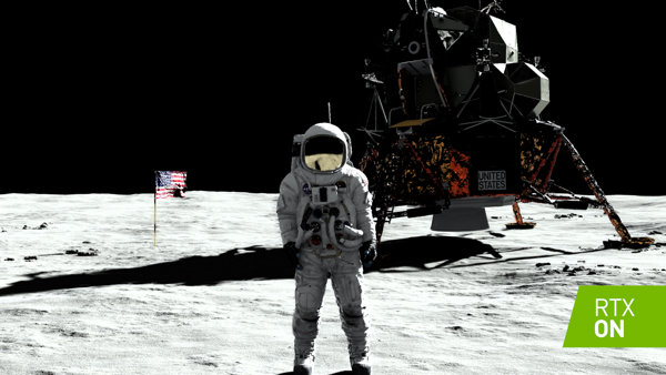 此前极客公园曾报道在登月五十周年时,英伟达用最新的 RTX 光线追踪和算法技术把五年前的登月 demo 翻修一新,创建了一个交互式可视化场景,结合光线在现实世界中的传播方式,让登月这一历史场景变得十分逼真。