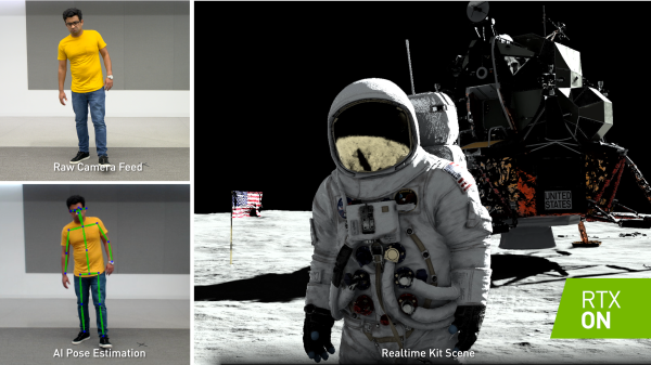在 SIGGRAPH 的现场,英伟达还搭建了一个登月 demo 的展台,通过英伟达研究团队最新设计的姿态估计技术,参展观众无需穿戴特定设备,通过展台里仅仅一台网络摄像头,英伟达就可以捕捉到体验者的动作,与 3D 渲染环境里,站在阿波罗十一号旁边的宇航员匹配,用户在摄像头前所做的动作,显示器里实时渲染中的登月宇航员会一帧不落地复制。英伟达称,这项 demo 综合了 RTX 光追技术、Omniverse 协作平台和 AI 应用等最新的研究成果。