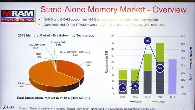 图1:存储器市场按产品类别划分的市场份额及市场增长趋势。图片来源/Yole