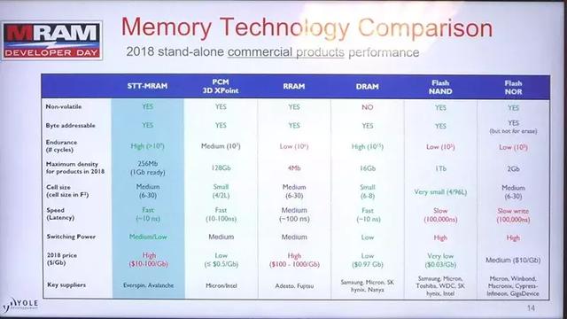 会上,Bertolazzi重点介绍了了MRAM技术。相比其他存储器技术,如:DRAM,NAND闪存,NOR闪存,PCM(3D XPoint存储器)和ReRAM,它又有什么特别之处呢?
