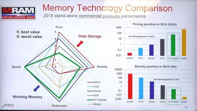 与2018年的单个存储器产品相比,MRAM在速度和重写次数方面具有优势,但价格(每个存储容量)和存储容量较差。在六种存储器技术中,价格(每个存储容量)是第二高的,存储容量是第二低的。