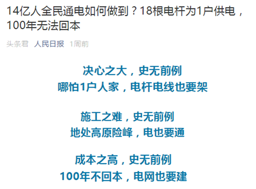 近日,人民日报官方微信公众号上推送了一篇标题为《14亿人全民通电如何做到?18根电杆为1户供电,100年无法回本》的文章,让我们看到中国提供电力普遍服务的决心和执行力。