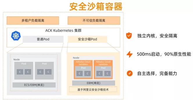 在这方面阿里云有一些差异化的优势:首先就是对它进行大量的性能优化,比如说它的网络跟原生的进程没有任何区别,网络性能非常好。整体能够达到 90% 的原生性能,对用户来讲可以获得非常好的安全性,同时对性能损耗是可以接受的。另外,能够让用户自主选择是 RunC 还是安全沙箱,两种容器运行时用户体验是完全一致的,用户可以根据自己对业务需求来选择合适的容器应用技术。