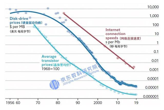 一是数据存储成本下降。1956年,每兆字节的数据存储成本约为9200美元(按今天的价格计算为85000美元),现在只要0.00002美元。