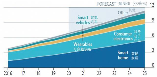 智能家居、消费电子、可穿戴设备和智能汽车正成为物联网技术在消费者领域的核心应用场景。据GSMA估计,未来5年中,智能家居将继续是物联网消费者领域最重要的组成部分,并保持高速增长。在家居场景中,消费者可以使用声控百叶窗和机器人吸尘器,并使用床垫来跟踪心率、运动和睡眠模式;亚马逊公司电视曾设想一款安装了视线追踪摄像头的智能电视,根据观众的注意力情况来调整场景的输出。