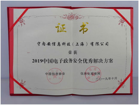 10月25日,首届中国电子政务安全大会在北京隆重召开。本次大会由中国信息协会主办,信息化观察网、国润互联信息技术研究院、中国信息协会传媒中心承办。守内安应邀参与本次大会,并在大会上展示了“等级保护2.0守内安邮件安全解决方案”。大会现场,信息化观察网副总、国润互联信息技术研究院副院长邓诚发布了《电子政务安全优秀项目》,守内安荣膺“2019中国电子政务安全优秀解决方案”。