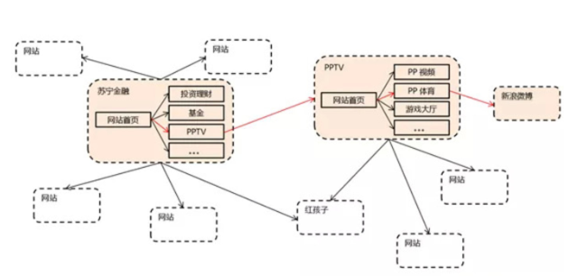 例如,用户从苏宁金融的网页为起点,浏览发现了PP视频的链接,点击后跳转到了PP视频主页,作为体育爱好者,在体育频道中找到了相关的新浪微博的内容,再次点击后又来到微博的页面继续阅读,从而形成了一条路径。如果把所有的可能路径呈现出来,就会看到一个网络结构。
