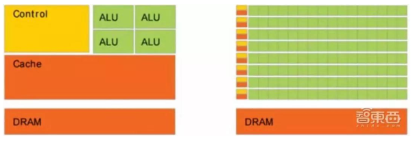 传统的CPU之所以不适合人工智能算法的执行,主要原因在于其计算指令遵循串行执行的方式,没能发挥出芯片的全部潜力。与之不同的是,GPU具有高并行结构,在处理图形数据和复杂算法方面拥有比CPU更高的效率。对比GPU和CPU在结构上的差异,CPU大部分面积为控制器和寄存器,而GPU拥有更ALU(ARITHMETIC LOGIC UNIT,逻辑运算单元)用于数据处理,这样的结构适合对密集型数据进行并行处理,CPU与GPU的结构对比如图所示。