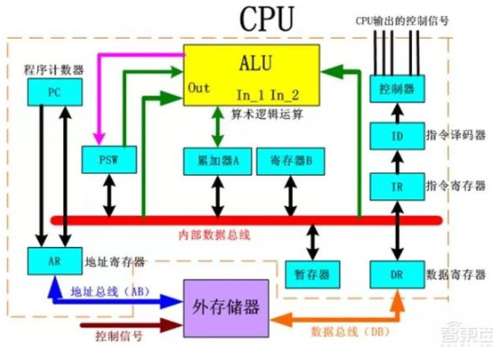 计算机工业从1960年代早期开始使用CPU这个术语。迄今为止,CPU从形态、设计到实现都已发生了巨大的变化,但是其基本工作原理却一直没有大的改变。通常CPU由控制器和运算器这两个主要部件组成。传统的CPU内部结构图如图所示: