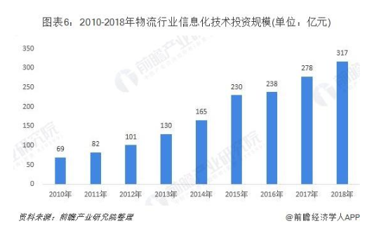 近年来,中国智能物流投资总体规模不断扩大,中国物流行业基础信息化建设已经进入一个相对稳定的状态,物流企业开始重视业务流程管理、客户资源管理、全程物流服务和供应链管理为基础的一体化服务等方面的投入,作为提升自身核心竞争力的重要手段。2018年全国物流行业智能物流技术投资规模达到317亿元左右。