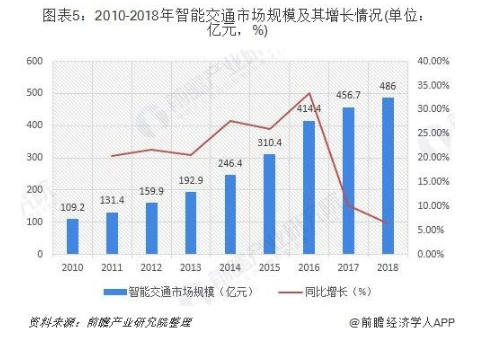近年来,众多政策纷纷出台支持智能交通产业发展,随着城市化信息技术的发展,城市智能交通产业规模也在逐年扩大。2018年我国城市智能交通达到486亿元,同比增长6.42%。