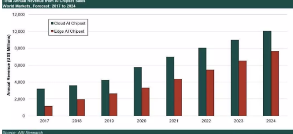 当前,物联网蓬勃发展,人工智能广泛应用,给英特尔带来新机遇。来自ABI Research调查报告,预计2024年全球云端AI芯片市场规模高达100亿美元。另外,部署在智能终端设备的AI芯片需求同样剧增,智能终端包括手机、安防摄像头、智能汽车、智能家居、各种物联网设备以及执行边缘计算的智能设备,因智能终端设备规模庞大,推动边缘AI芯片高速增长态势,2019年至2024年复合年增长率为31%。
