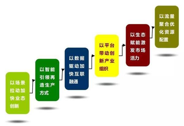 这种“场景拉动”,就是围绕需求再造与需要挖潜,通过数据、内容、服务、工具、体验的有机结合开辟新的市场空间、消费空间、应用空间或想象空间等,实现业态创新;“智能引领”就是将人工智能与大数据、云计算、物联网、移动互联网、5G以及其他新技术、先进制造相结合,形成新的技术构成、新的技术架构、新的组织方式、新的组织方式,最终产生新的生产方式;“数据驱动”就是加快将人流、资金流、信息流、物流、商品流等转化为数字流及其价值流,促进产业链、创新链、资本链、数据链、供应链以及人流、物流、信息流的资源共享、互联融通、开放创新、优化配置以及快速生成,加快互联融通;“平台带动”就是从做事到做局,不断优化企业作为生产组织方式、市场作为资源配置方式、集群作为产业组织方式之间的关系,打破企业边界、商业疆域、产业界限,带动产业组织创新;“生态赋能”就是从中心化的平台到去中心化的平台的平台,形成开放创新、共生共荣、共同成长的环境,激发市场活力。