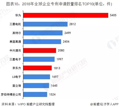 而从企业来看,亦是中国企业领先全球。根据WIPO数据,2018年中国的华为的专利申请量达到5404件,排名全球第一,遥遥领先于排名第二的三菱电机。此外,中兴通讯和京东方均挤进前十。
