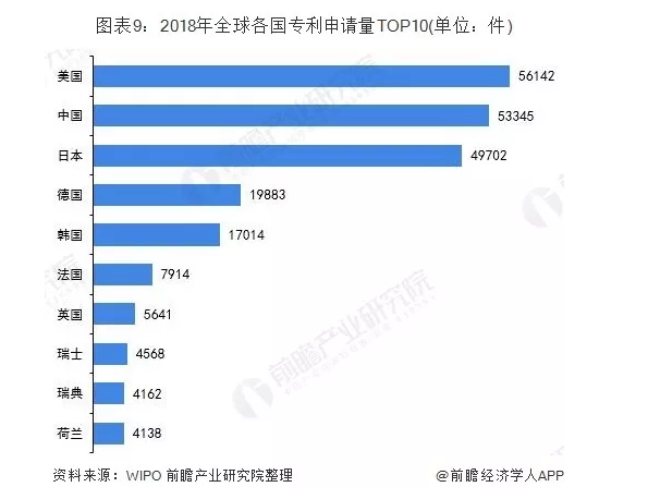 从专利申请量来看,中国发展潜力巨大。根据世界知识产权组织(WIPO)统计,2018年各国专利申请量排名中,美国以56142件专利排名第一;中国以53345件排名第二;日本排名第三,专利申请量为49702件。值得注意的是,WIPO预计,未来两年内中国或将超过美国成为全球第一。