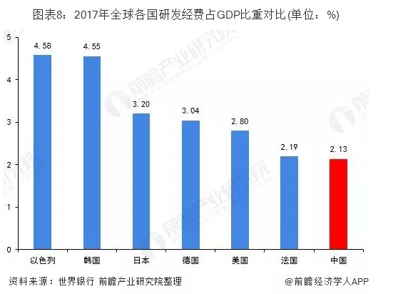 从技术来看,近年来我国研发经费投入强度一直呈稳定上升趋势,与发达国家的差距逐年缩小。根据世界银行数据,2017年我国研发经费占GDP的比重为2.13%,持续追赶法国和美国。