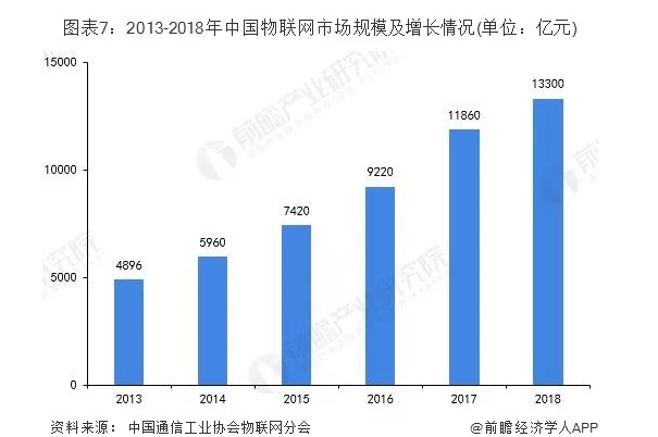 经过业界的共同努力,国内物联网产业链和产业体系初步形成,产业规模快速增长。根据中国通信工业协会物联网分会和MWC的数据显示,2013-2018年中国物联网行业高速增长,从2013年4896亿元增加至2018年的13300亿元,复合增长率高达22.12%。截至2018年底,公众网络M2M连接数达5.4亿个,产值超过10亿元的骨干企业已达120家。