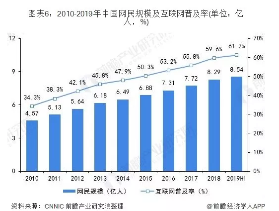 近年来,数字中国建设成效显著,信息基础设施建设加快推进。截至2019年上半年,我国网民规模达8.54亿,较2018年底增长2598万,互联网普及率达61.2%,较2018年底提升1.6个百分点。