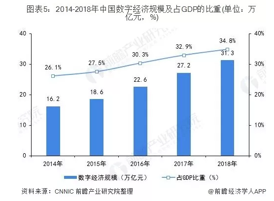 近年来,以先进科技为驱动,在经济发展需求的倒逼之下,数字经济规模增长速度惊人,中国的数字经济发展已经进入了一个赶超争先的阶段。根据中国互联网络信息中心(CNNIC)发布的第44次《中国互联网络发展状况统计报告》,2018年我国数字经济规模达到31.3万亿元,占GDP比重达到34.8%。在此基础上,我国将不断加快新一代人工智能与实体经济的融合,加快发展智能制造。