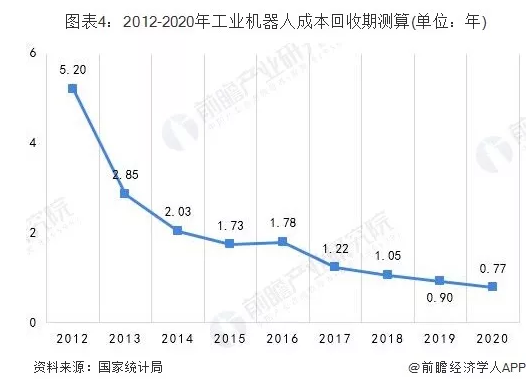 此外,假设一台工业机器人约可以代替4名工人,将维修费、机器折旧费等算入,根据测算,2018年工业机器人成本回收期约为1.05年,到2020年预计下降至0.77年。很明显,在人力成本上升和工业机器人回收期不断缩短的趋势下,工业机器人换人的临界点将至。
