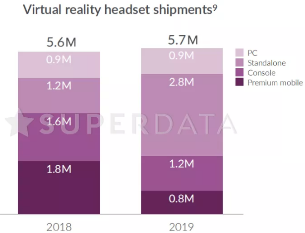VR硬件的出货量在2019年迎来了高速增长,根据Superdata最新公布的数据,2019年VR硬件出货量达到570万台,其中PC VR头显出货量为90万台,主机端VR头显出货量120万台。