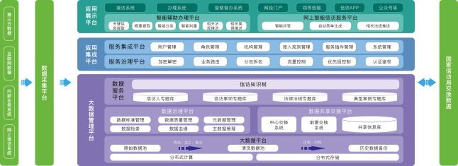 信访智办大数据支撑平台由信访大数据平台、智能辅助办理平台、网上智能信访服务平台三部分组成。