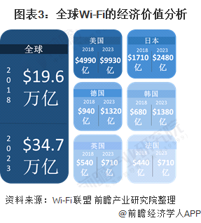 Wi-Fi6与Wi-Fi 5相比,大幅提高传输容量和速率,该性能可促进物联网的发展。根据Wi-Fi联盟报告,2018年全球Wi-Fi贡献的经济价值为19.6万亿美元,预计到2023年全球Wi-Fi的产业经济价值将达到34.7万亿美元。