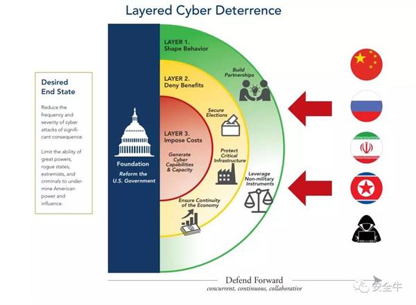 第一层防御的关键是美国与盟国合作以促进网络空间的负责任行为,第二层的重点是与私营部门合作以增强安全性,第三层要求保留对美国网络空间中的敌人进行报复的能力。
