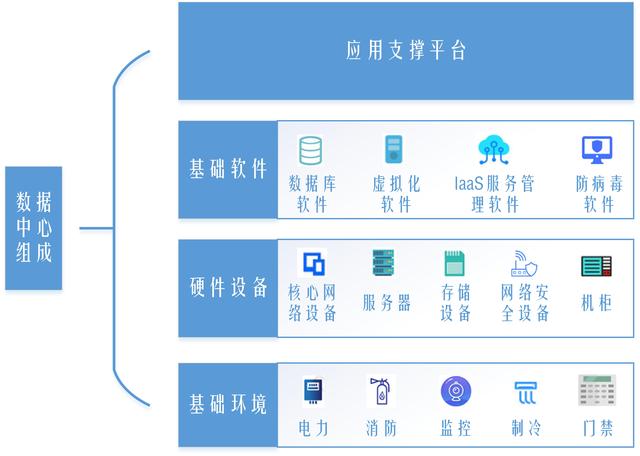 数据中心主要由基础环境、硬件设备、基础软件和应用支撑平台组成。其中,基础环境指数据中心机房及建筑物布线等设施,包括电力、制冷、消防、门禁、监控、装修等;硬件设备包括核心网络设备、网络安全设备、服务器、存储、灾备设备、机柜及配套设施;基础软件包括服务器操作系统软件、虚拟化软件、IaaS服务管理软件、数据库软件、防病毒软件等;应用支撑平台指具有行业特点的统一软件平台,能够整合异构系统,互通数据资源。