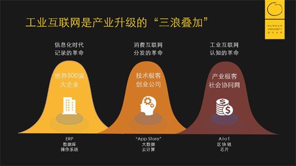 第三个时代就是工业互联网时代,它将要带来的是“认知的革命”。通过PC数据库叠加云计算、大数据和各种APP,人工智能、物联网、区块链等硬科技被链接起来,它们的共同特点是可以在物理世界中起作用。要知道,在消费互联网时代我们讲的是数据空间内的事,还无法触及物理世界,而今天,这些技术可以用在城市、工厂、交通系统中,这是一个重要的变化。