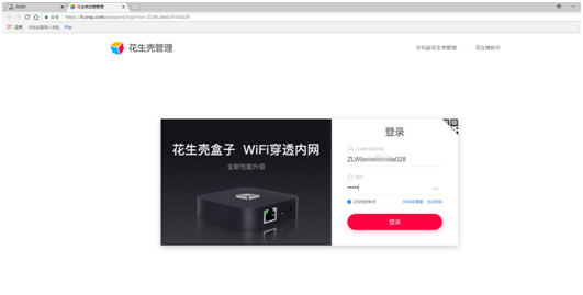 进入管理系统后,在“内网穿透”界面可以看到花生壳服务默认为开启状态,点击“登录”;