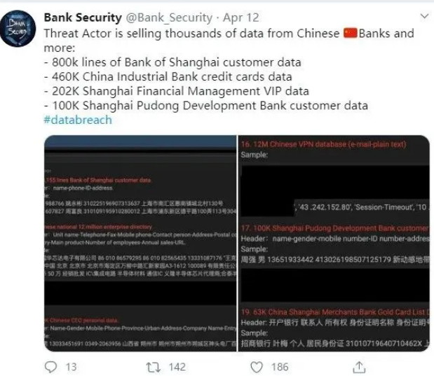 4月14日据国内外多家媒体及网络上爆出,涉及中国1200万条创业公司名录、226万银行卡数据,其中包含90万中国农业银行账号信息,80万上海银行客户数据、46万兴业银行信用卡资料和10万上海浦发银行客户资料在暗网被公开兜售。除此之外,还有20万条上海理财VIP客户数据、120万中国VPN数据库等信息,以及平安集团、中国人寿等金融机构的相关数据信息。