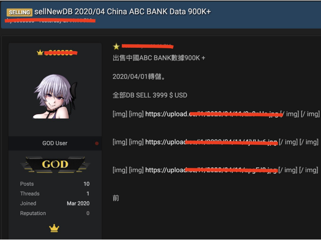 其中,90万中国农业银行账号数据被以3999美金明码标价出售,另外还特意写道:“仅需8美元,你就可以买到28万条国内的银行贷款信息,包括电话号码、银行卡号、家庭住址,这些信息特别适合做大众营销活动。”