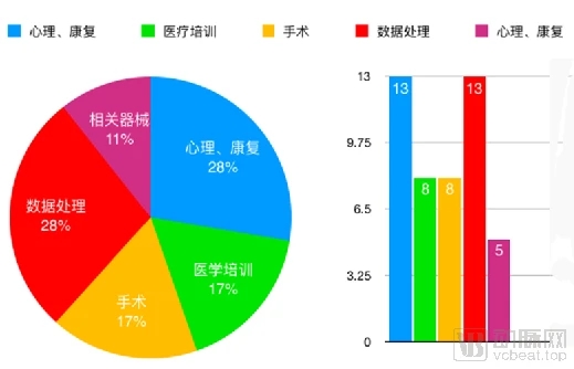 动脉网动观数据库总计收录了全球41家明确存在医疗VR相关研究且尚在运营的初创企业,这些企业大致都可分入上述三派,或是三派兼有。在这之中,从事心理、精神方面(现有养老领域VR产品的均是从心理角度出发)VR研究的企业总计13家,从事医院内VR研究的企业总计29家,从事器械相关研究的企业总计5家(有公司同时从事了多个部分业务)。需要注意的是,在医院内VR研究的企业中,有13家与VR医疗信息化有关。